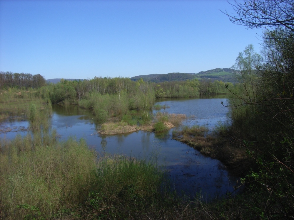Da ist die rekultivierte ehemalige Kiesgrube mit großiger Wasserfläche. Viele einheimische Vogelarten und rastende Zugvögel können dort von einem Aussichtspunkt beobachtet werden, der ebenso wie der nahegelegene Auenwald vom BUND gefördert wurde.